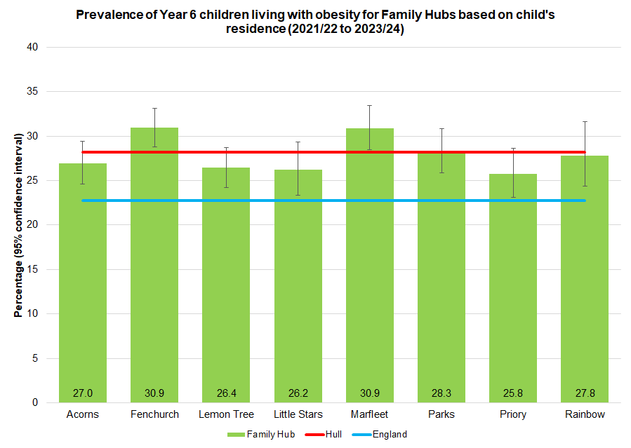 - From local analyses for the 2023/24 school year, across Hull’s eight Family Hub Clusters, there was variation in the prevalence of Year R and Year 6 children living with excess weight, obesity and severe obesity. The differences in the prevalence estimates among the Family Hub Clusters were statistically significant for obesity and severe obesity for Year R children and for excess weight and obesity for Year 6 children. The number of children living in the geographical area serving each Family Hub Cluster differed substantially, and more children lived in Fenchurch Family Hub Cluster area, it had the highest absolute numbers of Year R and Year 6 children who were living with excess weight, obesity or severe obesity.