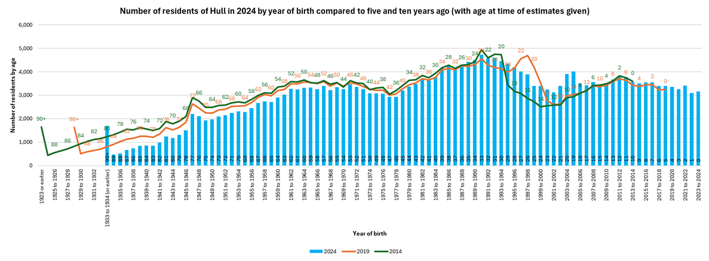 The most notable differences occur in the younger age groups. For example, in 2014, there were 2,585 residents aged 12 years in Hull, but in 2019 this had increased to 3,206 residents and increased further for 2024 to reach 3,790. This pattern also occurred for other teenage years, although there were differing patterns among older teenagers and those in their early 20s. In 2014, there were 3,164 residents aged 18 years compared to 2,754 in 2019 and 3,488 in 2024. In 2014, there were 3,444 residents aged 19 years compared to 3,536 in 2019 and 4,016 in 2024, and in 2014, there were 4,737 residents aged 20 years compared to 4,202 in 2019 and 3,900 for 2024. Thus there was a larger increase in the population aged 20 years compared to 19 years in 2014 compared to 2019 and 2024. It is likely that this is associated with the intake for the University and higher educational establishments in Hull as well as the locations of University halls of residents (some were/are physically located in East Riding of Yorkshire).